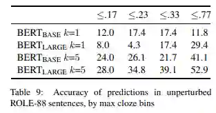 表 8 显示了这些扰动单独和一起的结果。我们观察到几个显著的模式。首先,删除对象(“-Obj”)或者主题(“-Subj”)对 BERT(BASE)k=1 或者 k=5 的精确度影响相对较小。这与我们在 BERT(LARGE) 中看到的情况大不相同,当对象或主题信息被删除时,其准确性会大幅下降。这些模式表明,BERT(BASE) 不太依赖主语 - 宾语结构的完整细节,而是主要依赖于参与动词预测的名词中的一个或另一个。另一方面,BERT(LARGE) 似乎对这两个名词都做了大量的使用,这样一来,任何一个名词的丢失都会对预测的准确性造成非平凡的破坏。