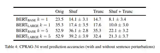 因为常识和语用推理是不常用的概念,所以值得探索 BERT 能在多大程度上基于简单的线索(如单词恒等式或 n-gram 上下文)实现这种性能。为了测试词序的重要性,我们对每个 item 的第一句中的单词进行无序排列,使信息混乱,但保留了所有单个单词的完整性(表 4 中的“shuf”)。