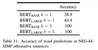 BERT 的预测准确性 我们首先测试 BERT 在 NEG-88-SIMP 中预测肯定上下文的正确类别延续的能力。表 11 显示了这些肯定句的准确度结果。