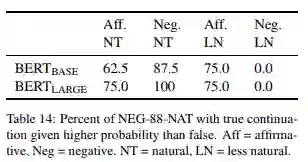 预测检验的定性分析 表 13 显示了 BERT(LARGE) 在肯定、否定两种情况下的预测示例。我们可以清楚地看到上述结果所显示的现象:对于肯定句,BERT 通常会产生正确的补语(至少在前两个),但这些补语在加上否定后基本上保持不变,导致许多明显不正确的补语。