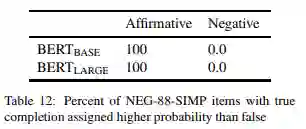 表 12 显示了结果,并且模式是鲜明的。当声明是肯定的(A robin is a __),100% 的 items 模型会分配更高的概率给正确的完成。即使阈值为 0.01,消除了对 CPRAG-34 和 ROLE-88 的许多比较,除了一个 item(对于 BERT(BASE)),其他 item 都通过了,这表明对正确的完成有着强烈的倾向。