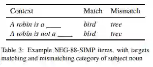 所需信息的预测 因为这些项目中的否定上下文是高度不受约束的(A robin is not a _?),因此预测准确度不是衡量否定上下文的有用指标。我们只测试肯定上下文的预测准确性,这使我们能够测试模型对上位词信息的使用(robin=bird)。目标否定出现在敏感性试验中。
