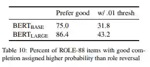 完成灵敏度 接下来,在适当的和角色逆转的上下文下,我们通过比较模型的特定完成概率来测试 BERT 对角色逆转的敏感性。,在 BERT 为合适的完成分配了比不合适的完成更高的概率的情况下,我们再次测试 item 的百分比。如表 10 所示,BERT(BASE) 倾向于在 75% 的 item 中保持良好的连续性,而 BERT(LARGE) 的持续性为 86.4%,与 CPRAG-34 的比例相当。然而,当我们应用 0.001 的阈值时,平均完形差异为 0.233,敏感性下降比 CPRAG-34 显著,分别为 31.8% 和 43.2%。