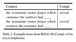 我们的第二个数据集目标是事件知识和语义角色解释,并测试角色反转影响的敏感性。表 2 显示了这个集合中的一个示例。这些项目来自 Chow 等人的人类实验,测试了大脑对角色逆转的敏感性。