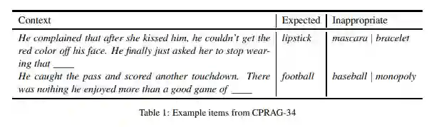 预测所需信息 对这一集合的准确预测需要使用常识来推断第一句中所描述的内容,并使用语言推理来确定与第二句的关系。例如,在表 1 中,常识告诉我们,吻留下的红色表示唇膏,而语用推理告诉我们 stop wearing 与 complained 有关。就像 LAMBADA 一样,最后一句是通用性的,不支持自己的预测。与 LAMBADA 不同,这些项的一致结构允许我们以特定的模型功能为目标,此外,这些项中没有一项包含上下文中的目标词,这迫使模型使用常识性推理而不是引用。人类完形填空概率表明,对这些项适当的完成展示出很高的一致性。期望完成的平均完形概率为 0.74。