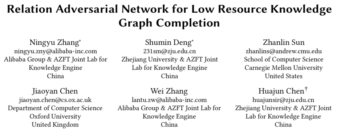 Ningyu Zhang, Shumin Deng, Zhanlin Sun, Jiaoyan Chen, Wei Zhang, Huajun Chen. Relation Adversarial Network for Low Resource Knowledge Graph Completion.
