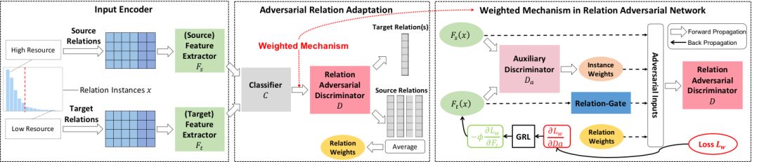 具体地说,wRAN框架利用关系判别器来区分来自不同关系的样本,并以此学习从源关系到目标关系易于迁移的关系不变性特征,主要包含三个模块: