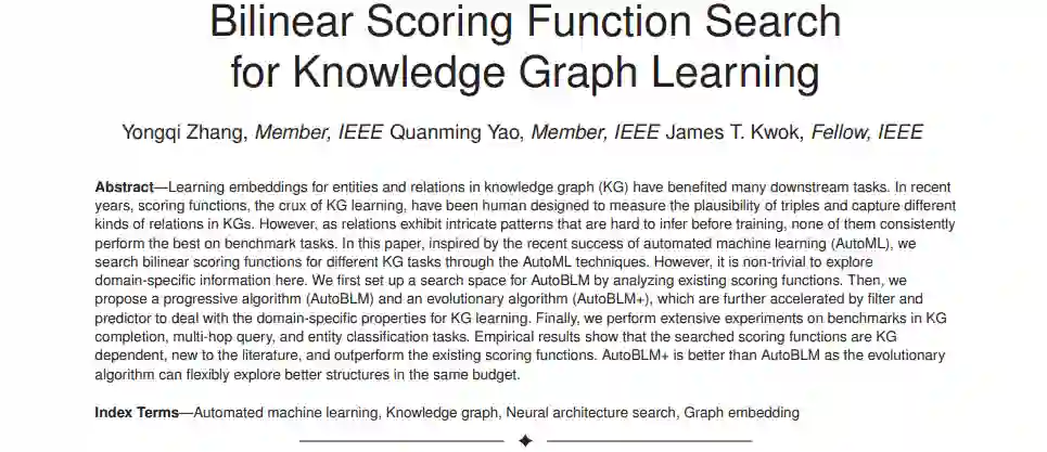 清华大学电子系机器学习课题组与第四范式和香港科技大学合作论文《知识图谱学习的双线性评分函数搜索》(Bilinear Scoring Function Search for Knowledge Graph Learning)近期发表于IEEE模式分析和机器智能学报(IEEE Transactions on Pattern Analysis and Machine Intelligence ,IEEE TPAMI)。