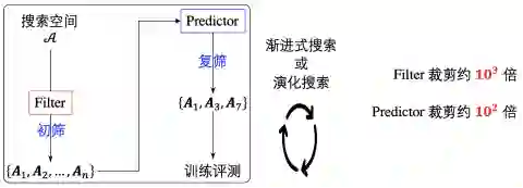 考虑到搜索空间非常巨大且训练和评估每一个结构都需要非常多时间,如何快速有效地搜索更好的结构,是搜索算法所需要关心的问题。AutoBLM在搜索算法的设计上,充分考虑了搜索空间的性质,在给定结构的基础上,对结构先进行一定程度的筛选,再进行模型评估,从而节省开销。如图5所示,AutoBLM利用Filter过滤掉一些非满秩、等价的结构进行初筛,再利用Predictor对结构的对称性特征进行评估,进一步筛选出可能较好地几个结构,对搜索空间进行大幅度的裁剪。在外层,AutoBLM利用渐进式搜索方式,AutoBLM+利用演化的搜索方式,不断迭代、优化,得到更好的结构。