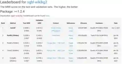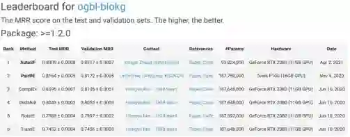AutoBLM在知识图谱学习代表性任务链接预测上进行了实验,均超过了手工设计模型的效果。此外,AutoBLM还在大型生物知识图谱ogbl-biokg和维基百科图谱ogbl-wikikg2上表现优异,OGB[6]是目前公认的图学习基准数据集代表,由斯坦福大学Jure Leskovec教授团队建立,于2020年国际顶级学术会议NeurIPS上正式开源。以质量高、规模大、场景复杂、难度高著称,素有知识图谱领域“ImageNet”之称,AutoBLM曾在2021年4月分别拿到第一名成绩,刷新榜单记录(见下图AutoSF)。