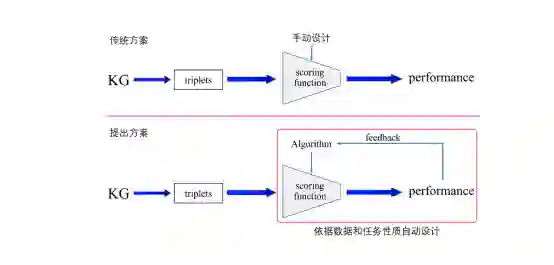 如图2所示,通常来说知识图谱领域的评分函数是人为定义设计的,这需要很强的专家知识,对任务、数据有着独到的理解。自动化的解决方案,算法根据模型效果的反馈,来自主设计评分函数,通过不断循环迭代来优化评分函数,实现在特定任务数据上低门槛,高性能的评分函数设计。