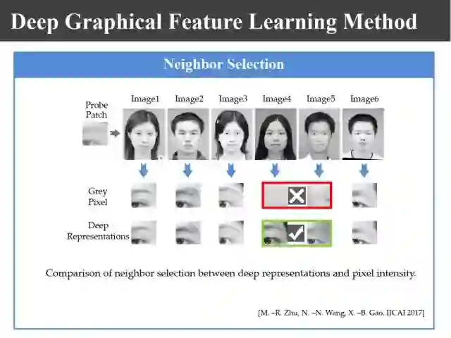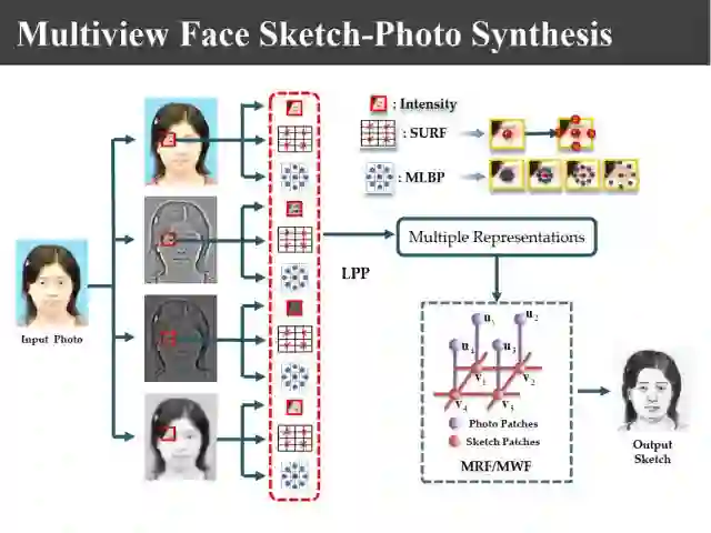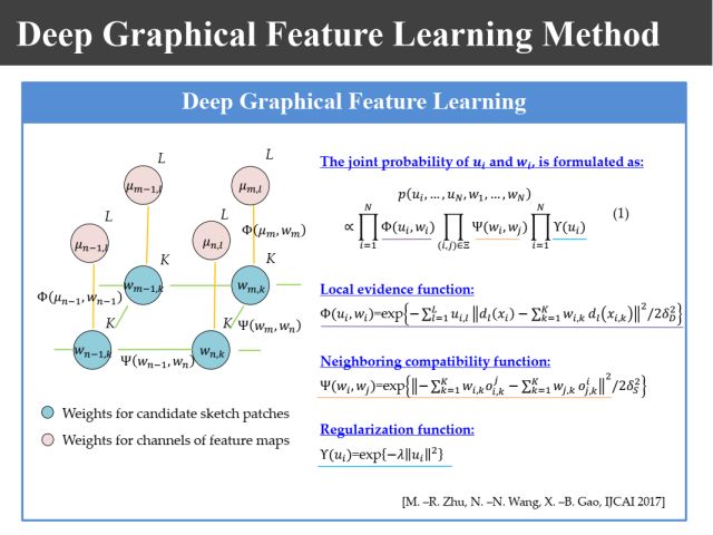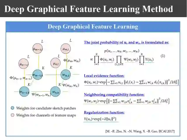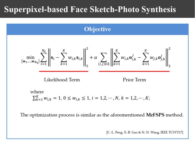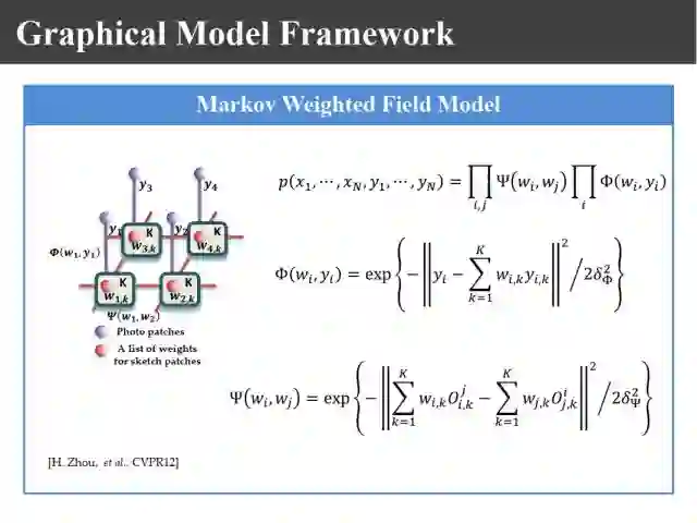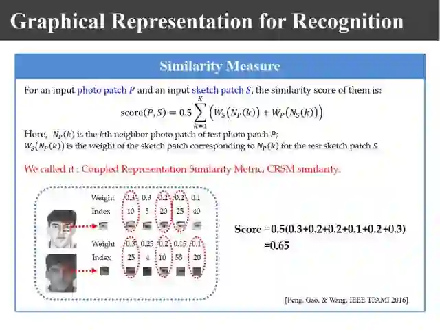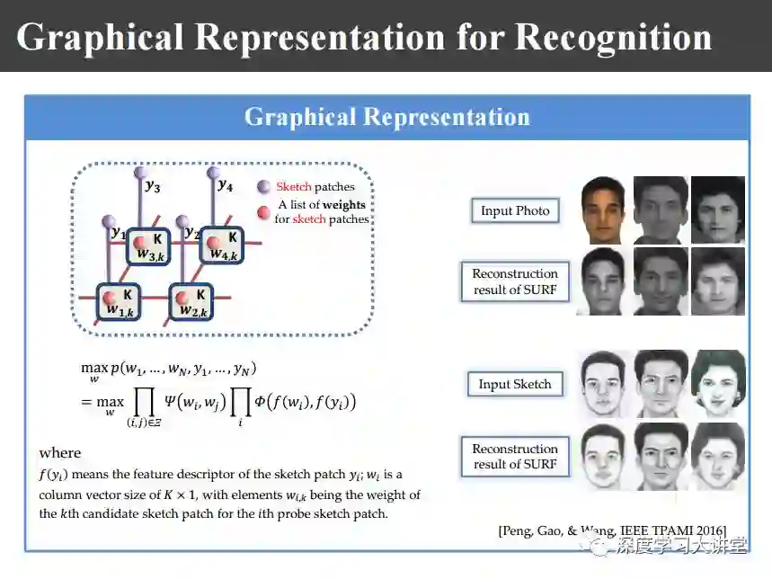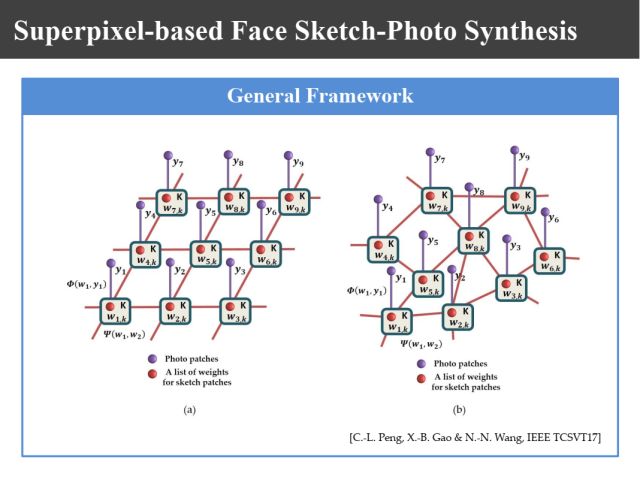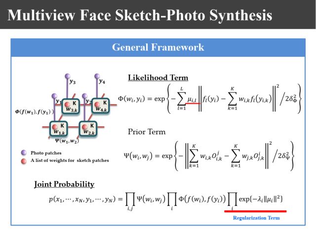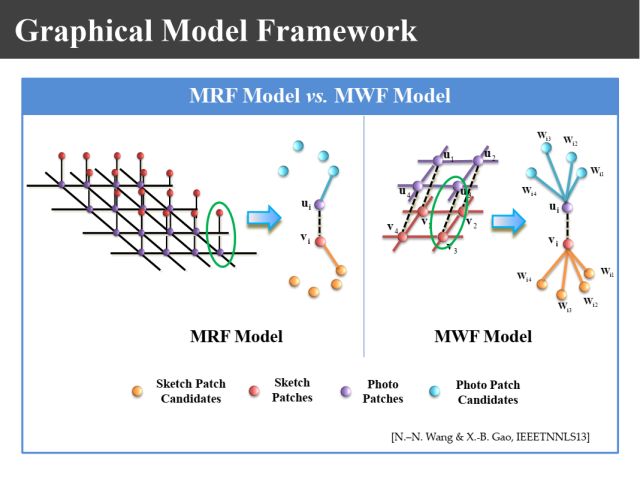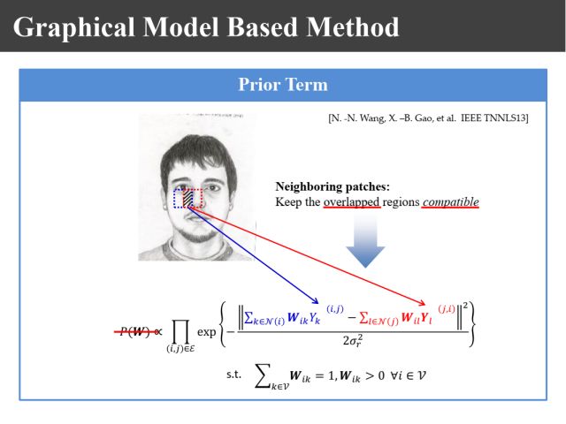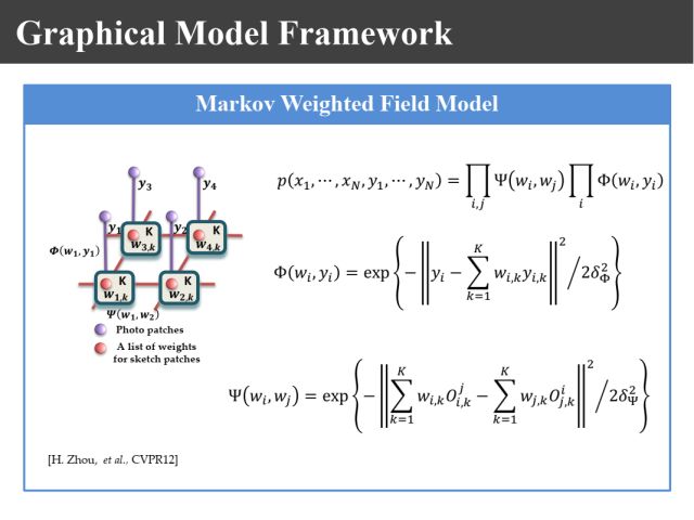 上图是香港科技大学学者在CVPR2012提出马尔科夫加权随机场模型。在考虑块和块之间的关系时,把每一块又使用k近邻来表示,变成k近邻和k近邻之间的约束关系,同样分为画像和照片之间的关系和照片和照片之间的关系。