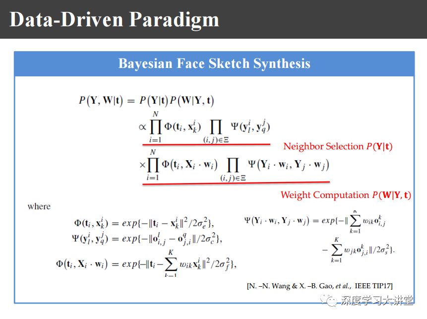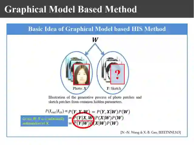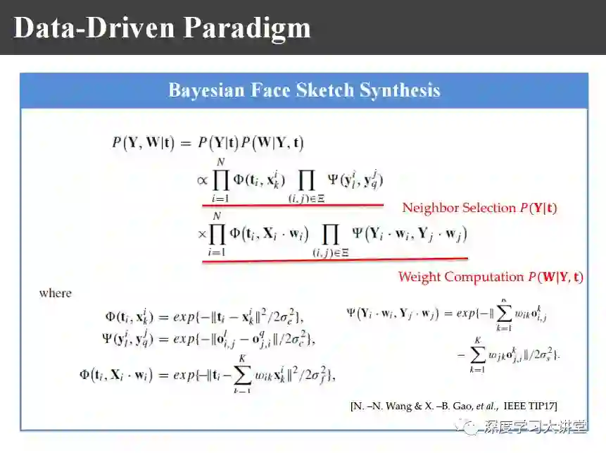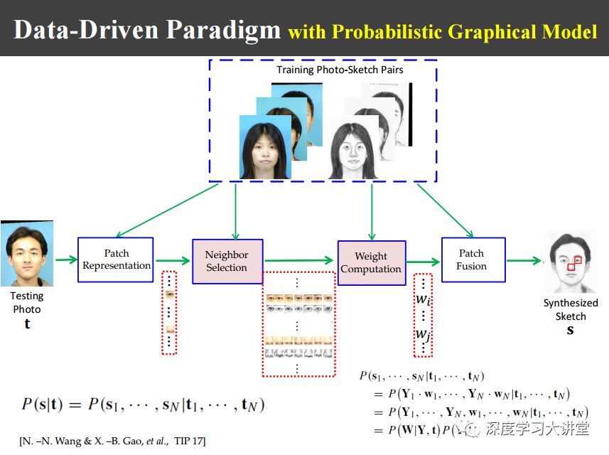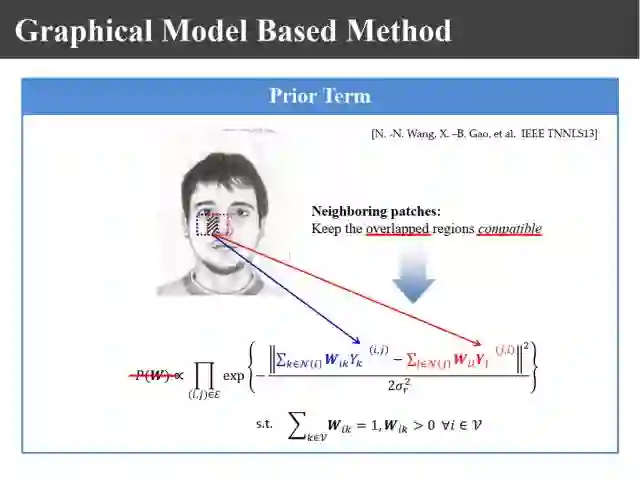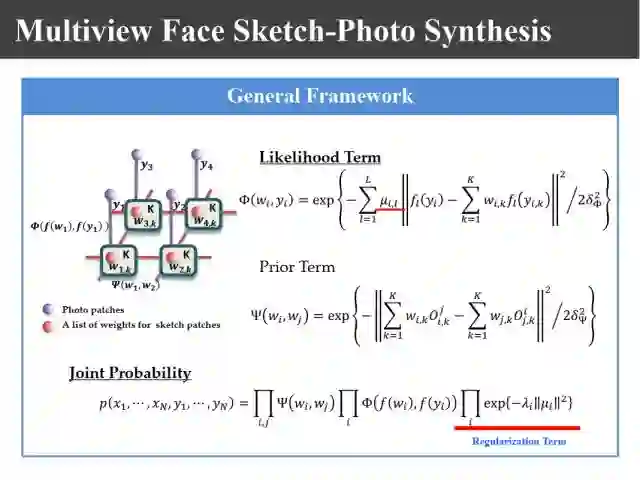 09年在PAMI上有上图所示的王晓刚教授的一个工作,提出了利用马尔科夫随机场理论来进行画像的合成。过去我们生成画像块的时候只是利用照片和画像之间的关系,其实要生成画像的话,相邻画像块之间也有约束关系,为此提出了嵌入式的马尔科夫模型。这里面就有两个似然函数,一个表示画像和照片之间的关联性,一个表示画像块之间的兼容性。