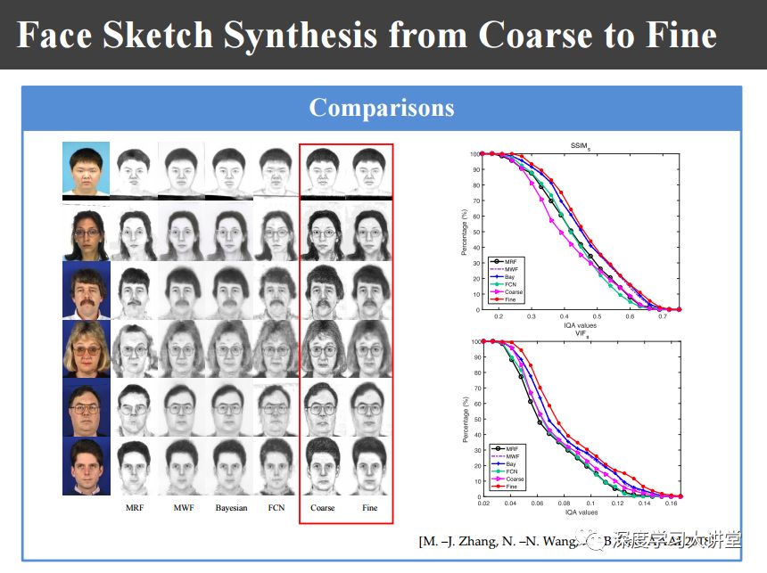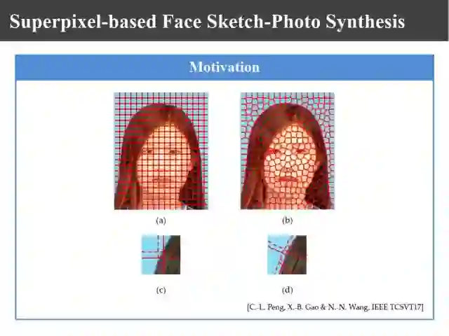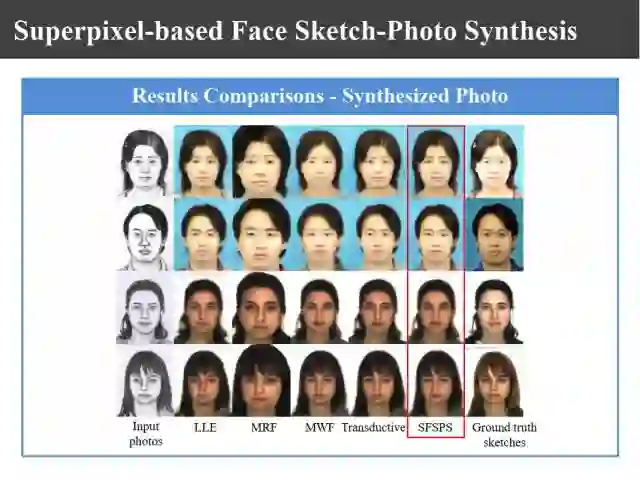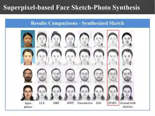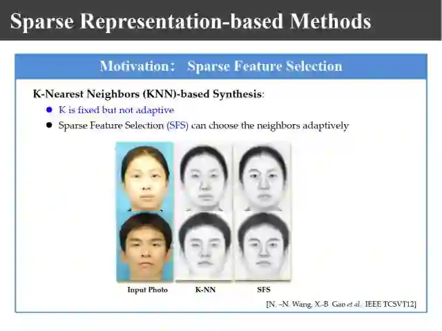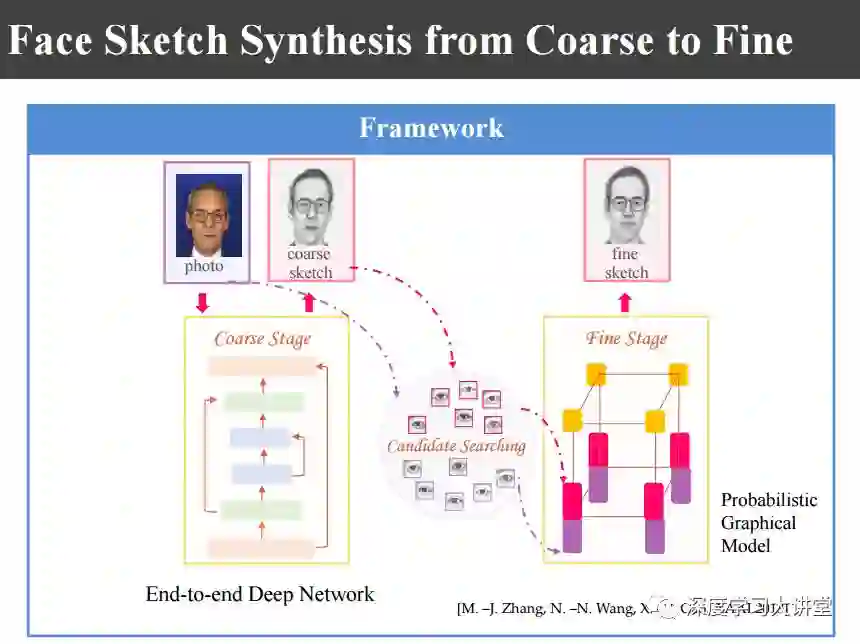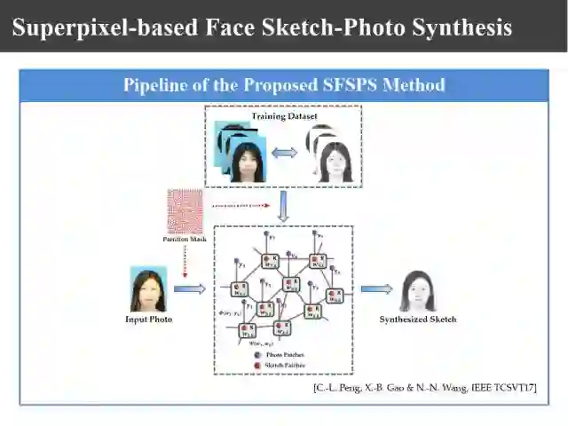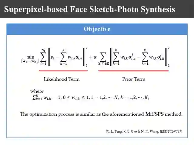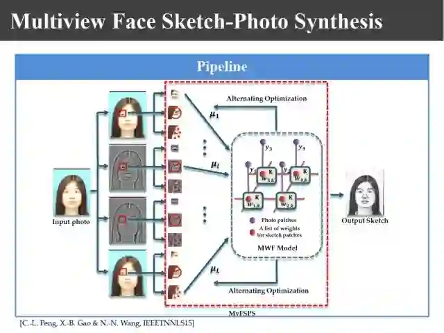 首先利用贪婪学习算法生成初始的画像,然后利用照片和画像,分别使画像和画像匹配去寻找K近邻,基于照片和照片匹配去寻找K近邻,基于照片和画像匹配去寻找K近邻,由于画像和照片它的高频分量比较吻合,利用它做先验知识来选择一个最佳的K近邻然后进行合成,最终进行迭代以后仍然可以得到好的结果。