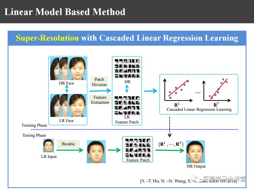 2017年的工作是把前面的相关工作进行了系统总结。我们发现整个算法流程基本上分为几个模块:对于给定的训练数据库,首先要对每一幅照片-图像对进行分块,进行图像块的描述,也就是说怎么来表示每一个图像块,另外就是近邻块的搜寻,怎么来寻找最近邻图像块,另外是怎样优化加权的权值W。
