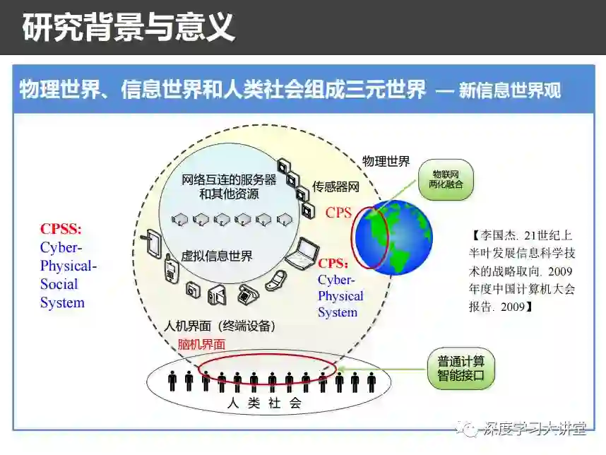 它的哲学基础就是上图李国杰院士提出的新信息世界观:物理世界、信息世界和人类社会组成的三元世界。