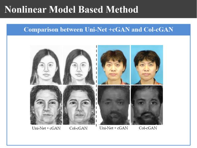 接下来,重点来讲一下讲异质人脸图像合成和识别。关于异质图像的合成和识别我们做了将近十几年的工作,我今天系统总结一下。整个工作可以分成两大类,一种是基于online学习的data-driven的方法,通过输入照片以后,利用训练照片画像对来合成画像或者由画像合成照片。而offline学习的model-driven的方法则是通过机器学习学到model以后,不再需要训练样本,将输入通过映射函数得到生成的画像。