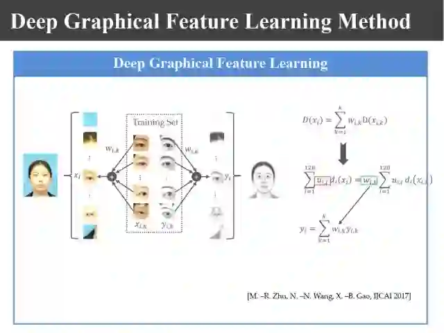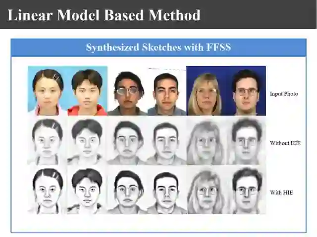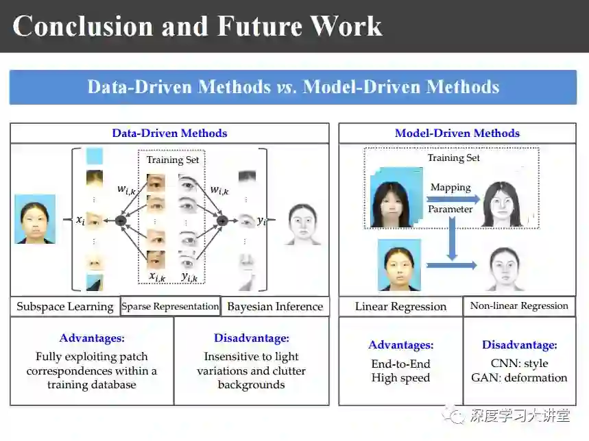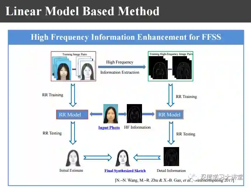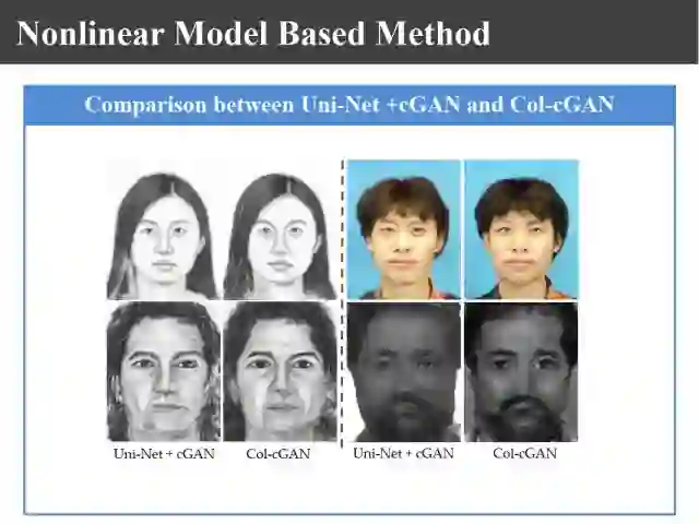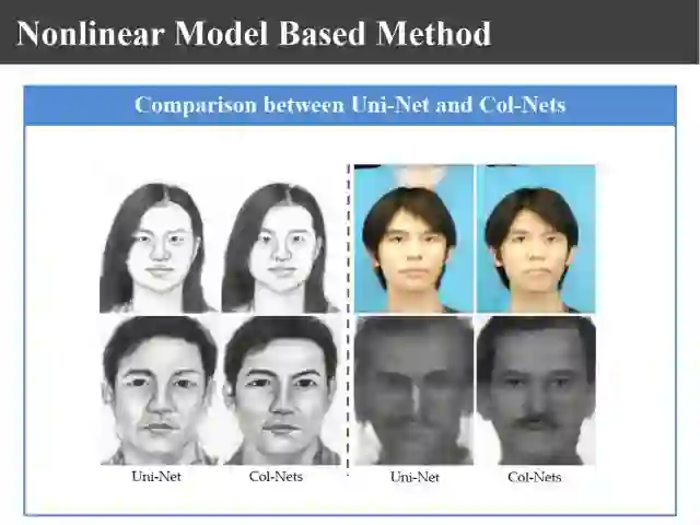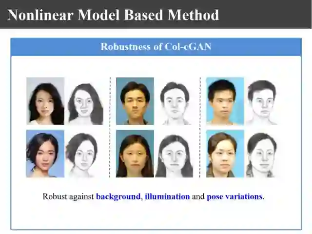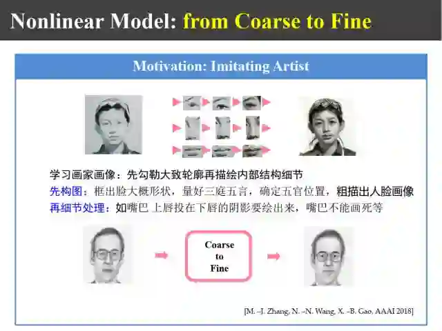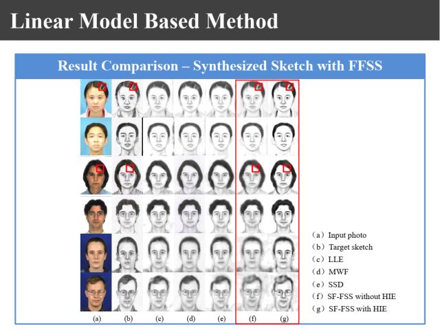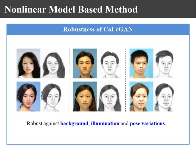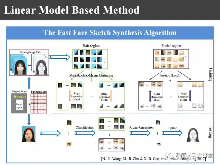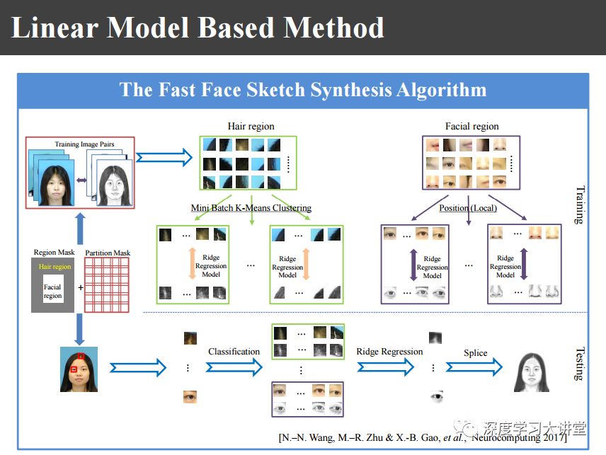 上图是一个基于线性模型的方法,基于Ridge Regression脊回归的简单工作。给定一幅图像之后,我们首先进行区域划分,分成头发区域和人脸区域,对于头发区域利用mini batch K-means算法进行聚类,聚类以后对类内进行脊回归;对于人脸区域仍然找它的近邻,眼睛找眼睛区域,鼻子找鼻子区域,对每个区域基于位置进行脊回归,然后把两部分回归的结果进行组合之后就可以得到合成的画像。