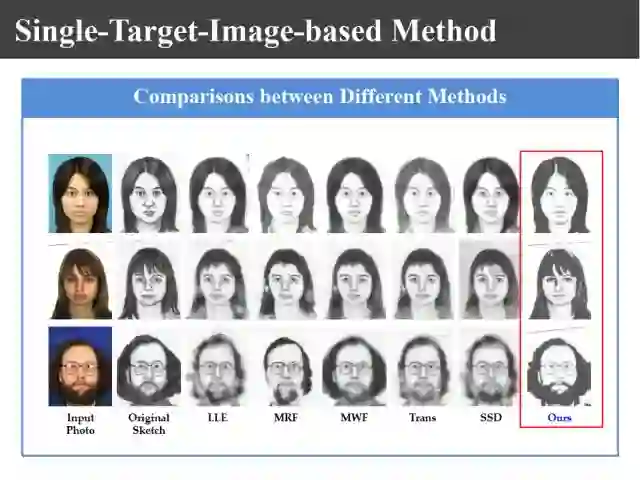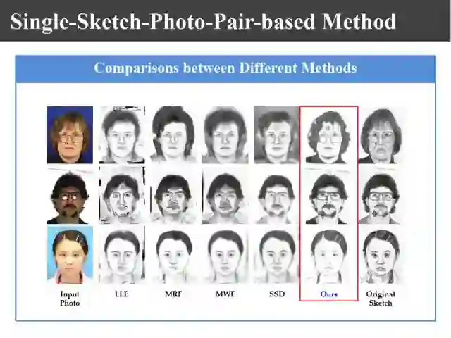 上图展示了采用不同的方法由照片合成的画像的效果,虽然只有一个照片-画像训练对,但是所合成的画像质量还是不错的。