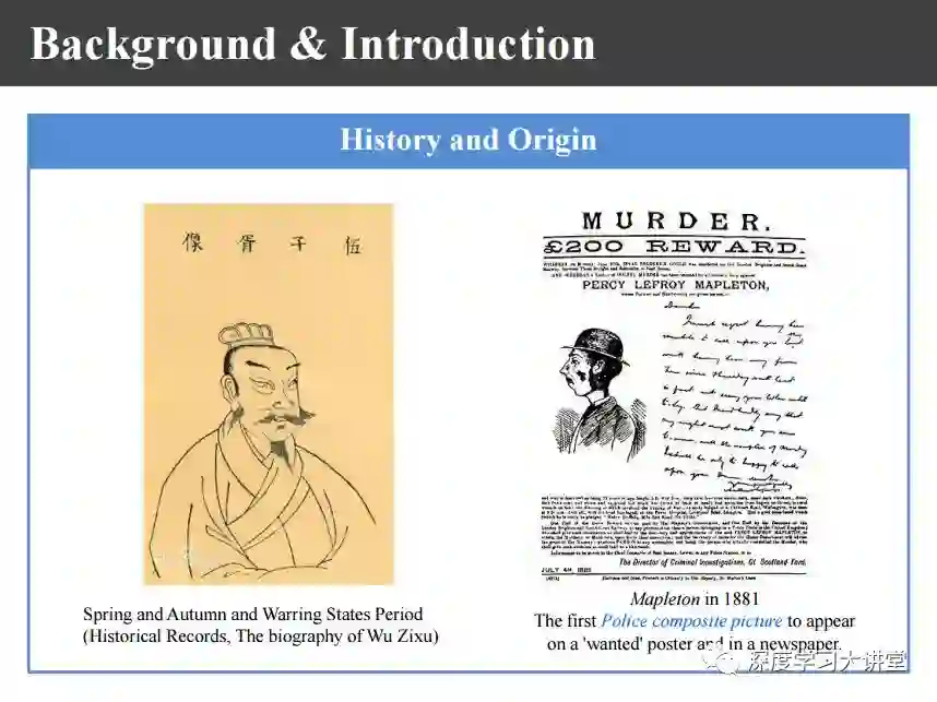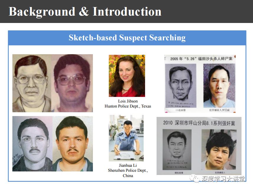 基于画像追凶有实际案例。上图中上方的吉布森女士是休斯敦警察局的职员,她有一次下班时遭到抢劫,因为她是画家就把画像画出来,结果第二天就破案了,从那之后她已经破了2000多个案件。画像追凶来自中国,为什么成功在美国呢?我就在网上搜索了一下,发现我们国家也有这样的人才,比如深圳警察局的李建华同志,利用他的画像追凶已经成功侦破了几个大案,所以画像追凶确实可行。
