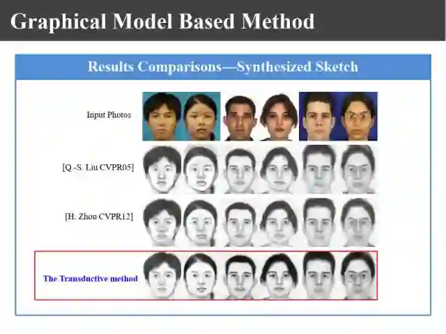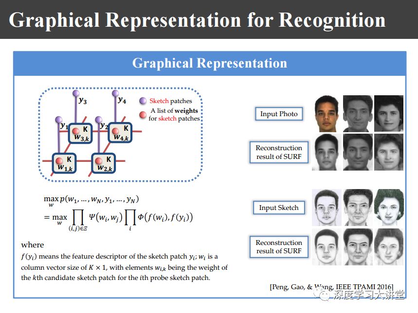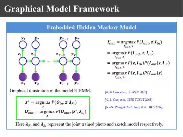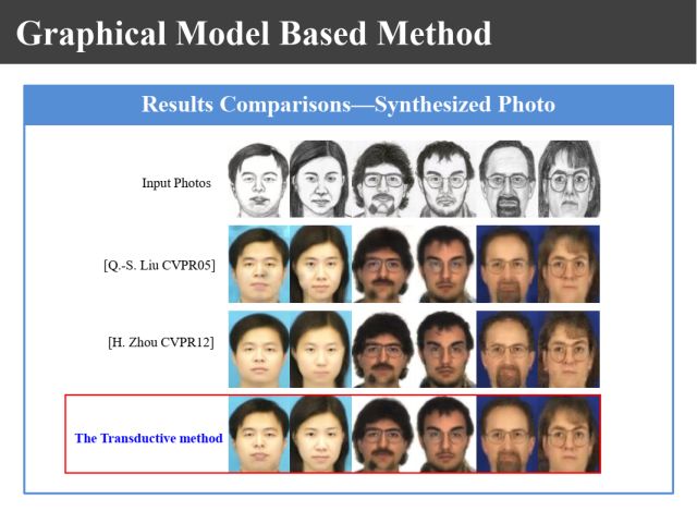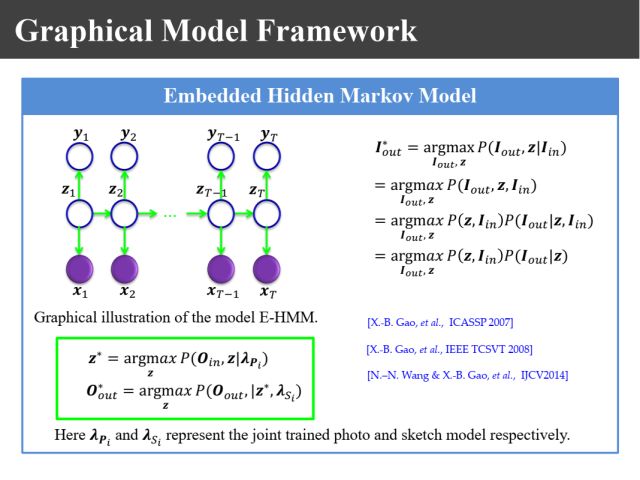 上图是我们在2007年的时候提出的嵌入式模型合成方法。把画像和照片看成是观测序列,同时存在一个隐含状态和状态转移空间,利用状态转移矩阵得到合成模型,然后基于该模型实现画像或照片的合成。2014年在IJCV上我们对它做了新的解释,完全可以用最大后验概率或者概率图模型进行解释,这样我们就把它统一到概率图模型的框架上去。