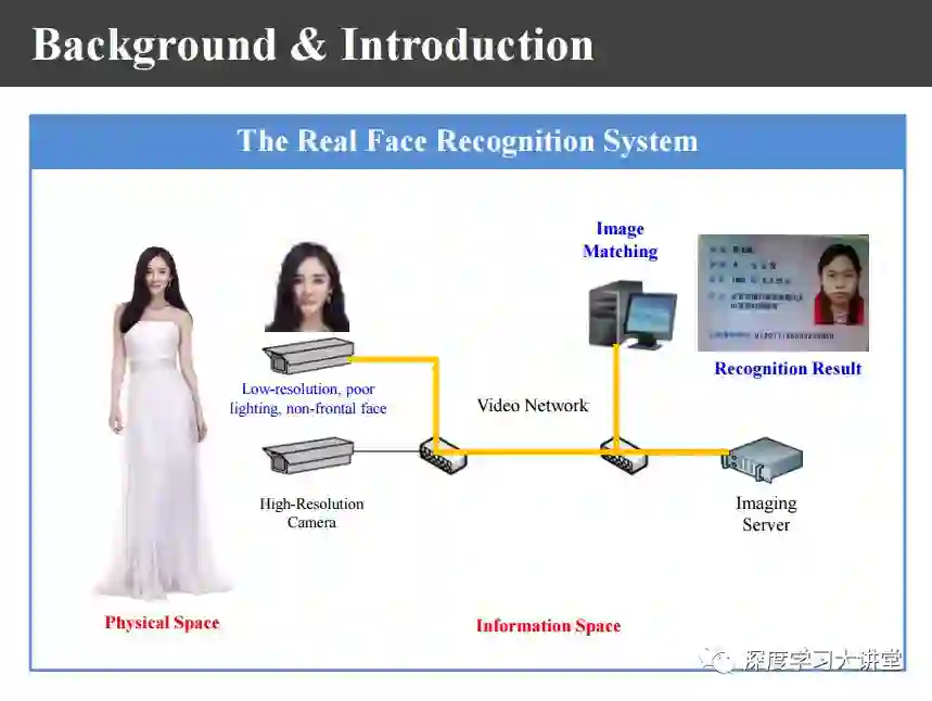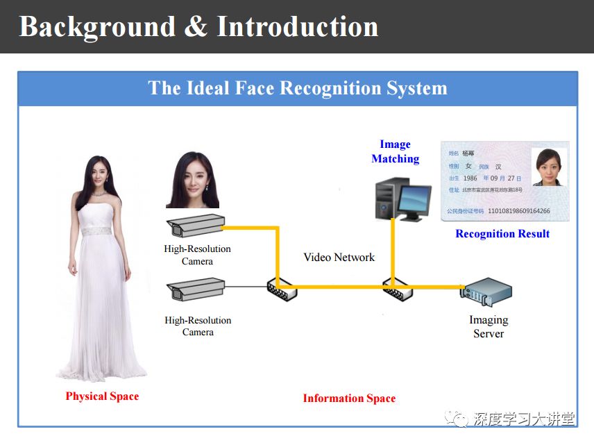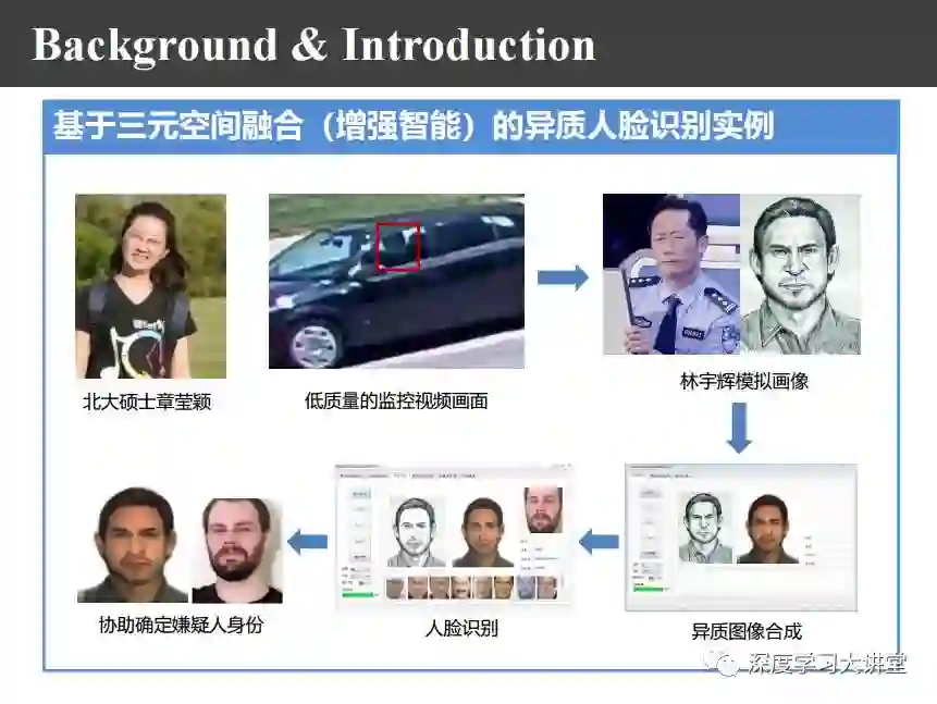 首先,我们来看一下异质图像合成与识别的背景。对于模式识别任务来说,理想的识别系统经过比对以后可以很容易地识别出这个人的身份。上图是理想的人脸识别系统。