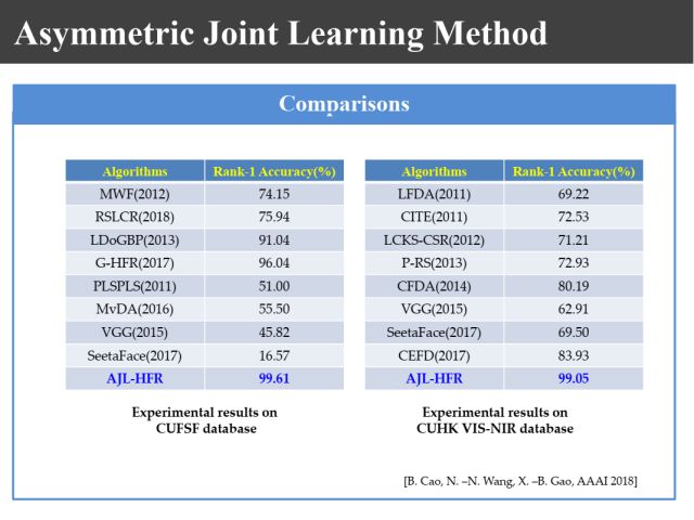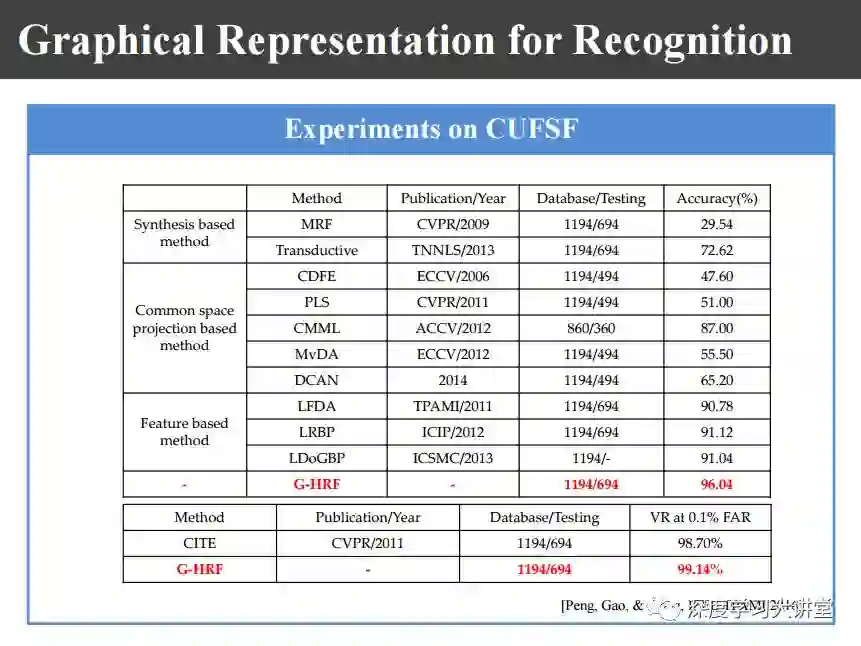 在上图不同数据库上做识别以后,我们现在识别结果在CUFSF数据库上可以达到99.61%,在CUHK VIS-NIR数据库上达到99.05%。