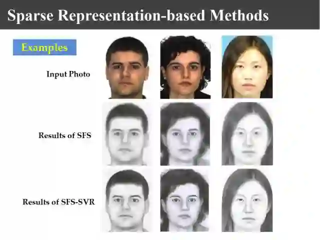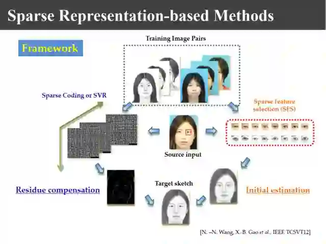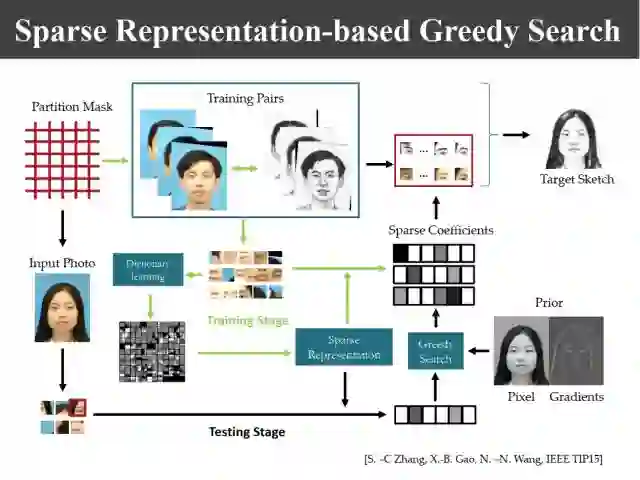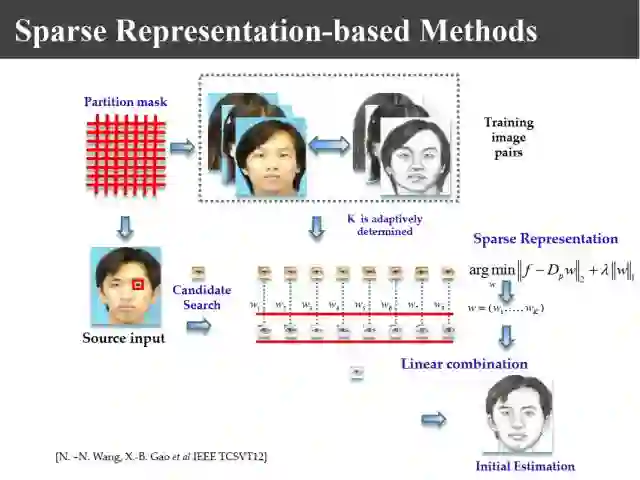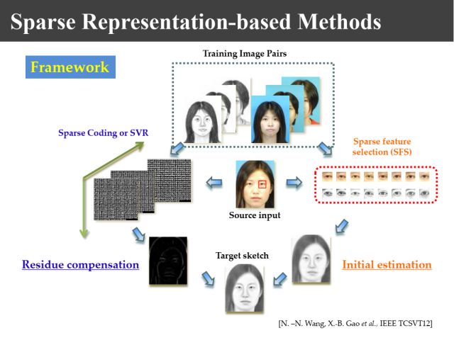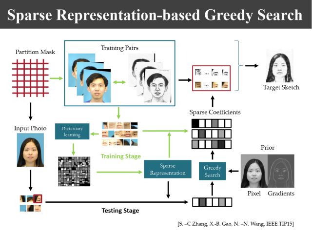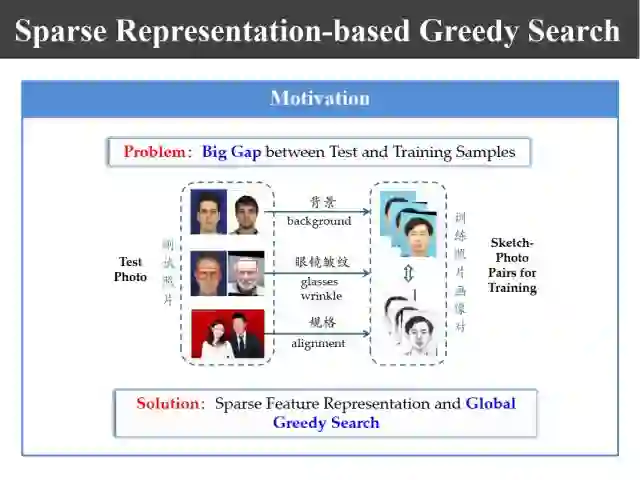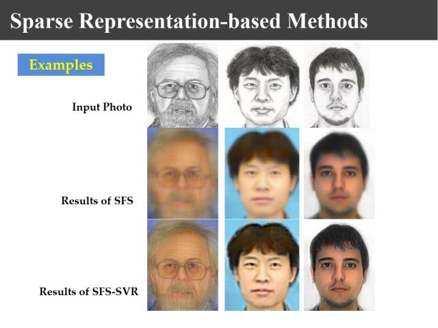 实际上,基于data-driven的方法也还存在其它问题。比如,上图所示的训练数据库里面没有出现的情况我们很难合成出来。比如说背景不一样,或者训练数据库里面都是年轻人,香港中文大学的数据库中的照片都是年轻人的,如果合成老年人,它的皱纹很难合成出来;如果数据库里面没有戴眼镜的,要想合成戴眼镜很难,因为我们眼睛的合成区域总是找相应的眼睛区域来合成的。这样就使得合成出的画像与待测试样本之间有差别,为此我们利用稀疏表示和贪婪学习的方法设计新的方法,就是进行全局搜索。
