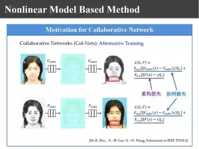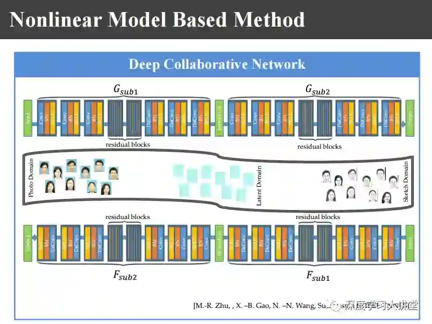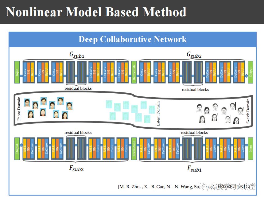 这样一来我们希望把画像和照片、照片和画像之间两个映射在隐空间里面达到相似,这样一来我们提出上图的深度协同网络。