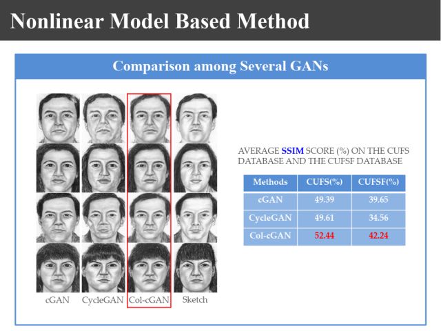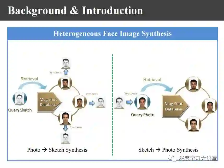 如上图所示,通过把画像转化为照片,我们发现转化之后的识别结果就正确了。所以我今天报告的主题就是异质图像变换,主要包括画像和照片之间的转换。其实不仅仅局限画像到照片,其他异质照片也可以通过机器学习来转化。