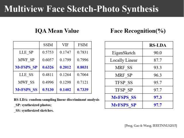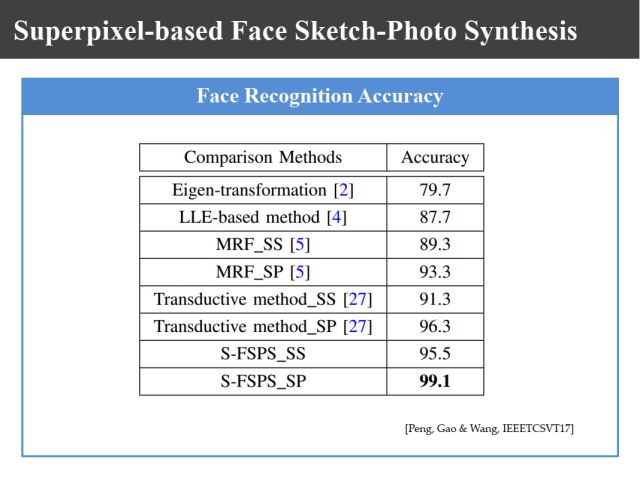 同样还可以用合成出来的照片和画像进行模式识别。如上图所示,在香港中文大学的数据库上可以达到97%左右的正确率。