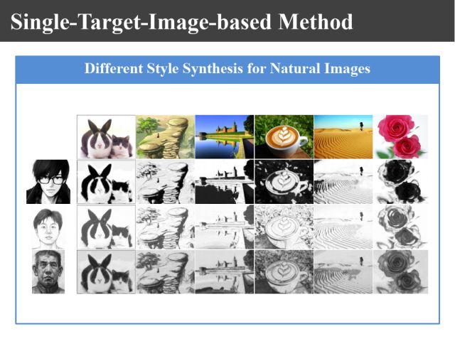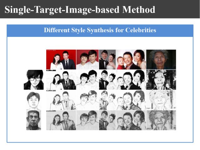 同样地,对于非人脸图像的其他图像来说,也可以生成如给定的人脸图像风格一样的画像来。上图中分别展示了根据动漫风格、简单素描、复杂素描风格进行合成的画像。
