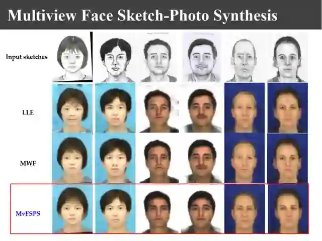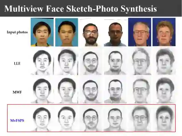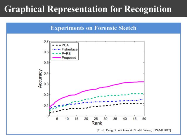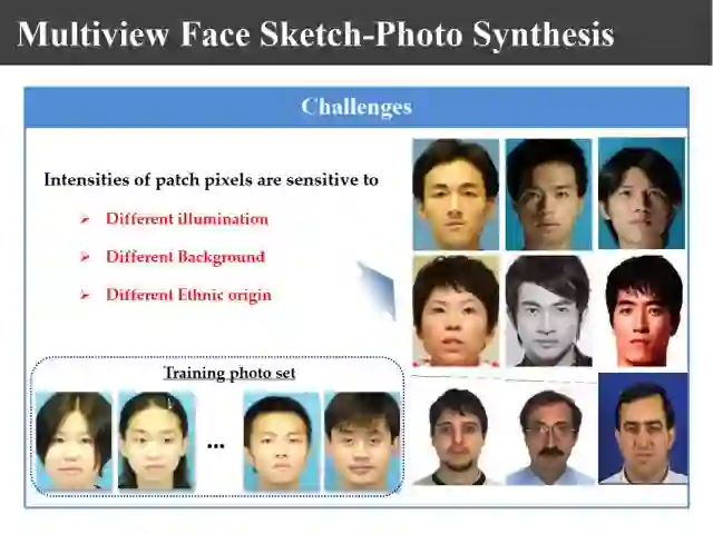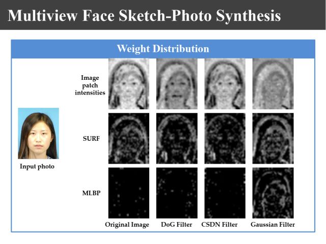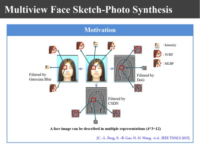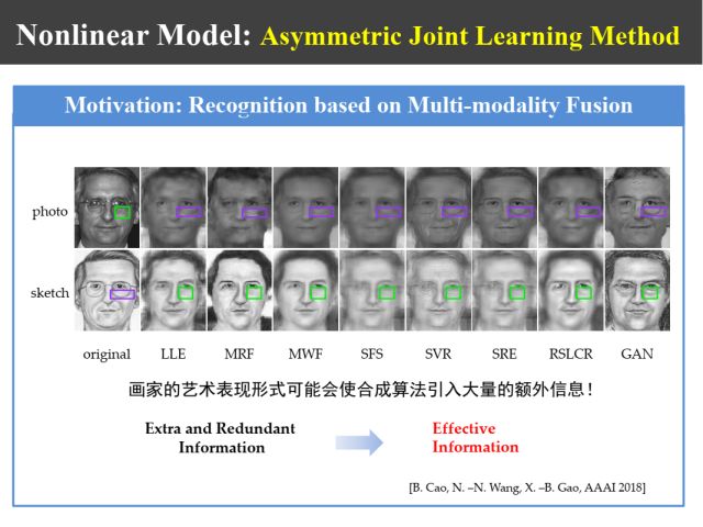 比如说上图中有些区域,比如说眼袋,不同合成方法合成出来的情况不一样,具有多样性。另外比如说眼镜,眼镜本来没有框,为了画像的效果画家往往会给眼镜画了一个框,合成出来结果有的有框有的没框。那么,如何利用这些额外信息提高模式识别的鲁棒性呢?这为我们的研究提供了新的线索。