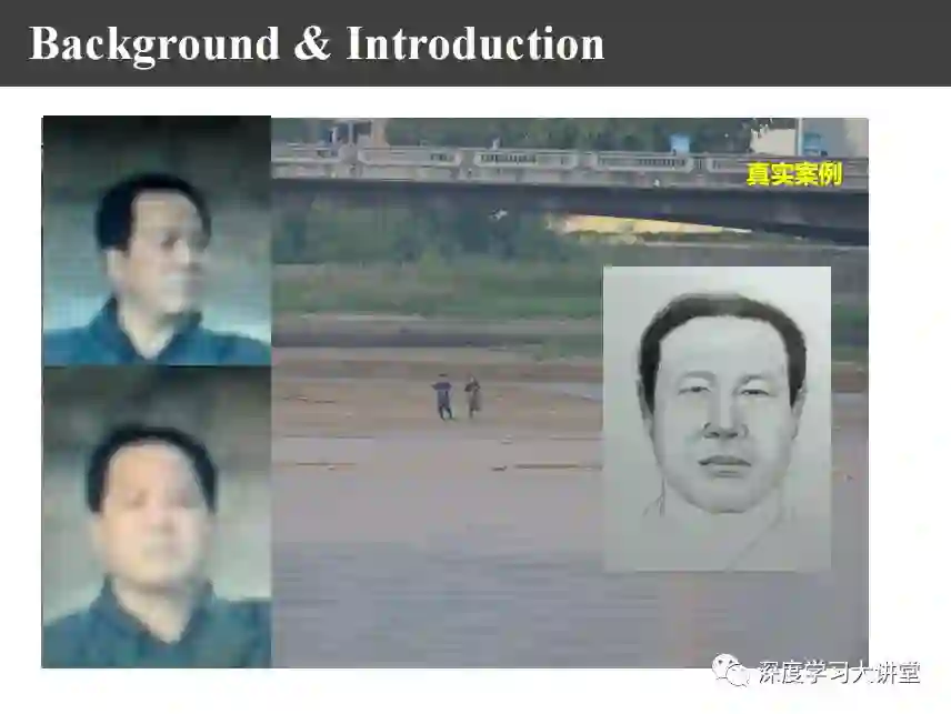 上图是一个真实案例,有人在河的对面发现了两个逃犯,于是拍了照片发给公安部门,由于分辨率太低公安部门的识别系统根本识别不出来,但是善于素描的人员可以通过想象、经验画出画像,再利用画像来排查嫌疑犯。