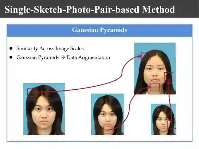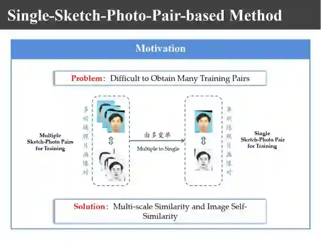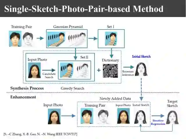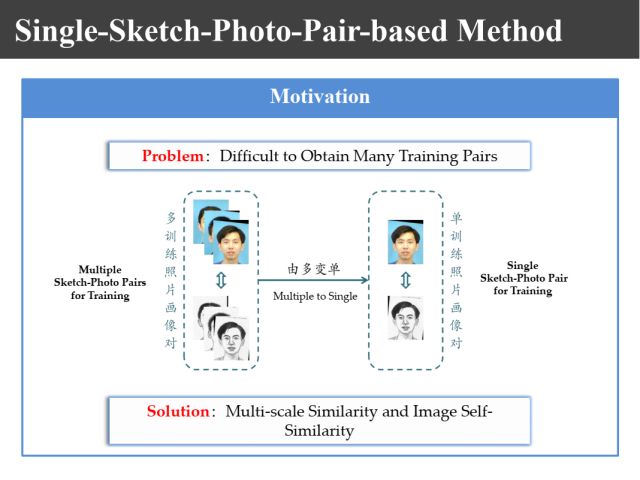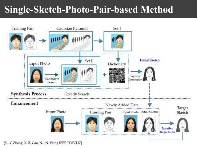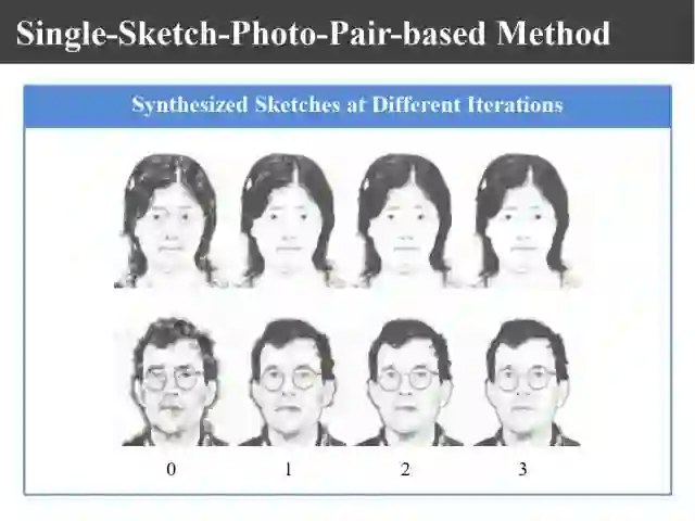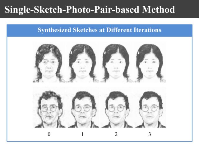 这样如果只有一个训练对的话,利用高斯金字塔可以生成一系列不同尺度的照片和图像对。可以通过合成字典,同样利用刚才讲的贪婪学习方法合成出初始的画像。然后把训练样本和测试样本生成的初始画像这两对放在里面进行迭代,依然可以生成高质量的合成画像。