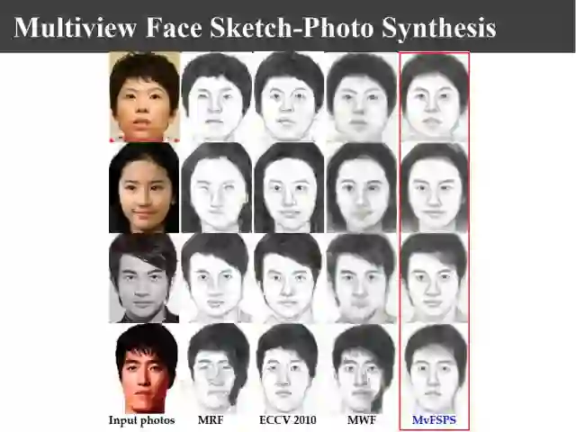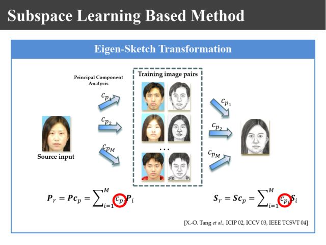 上图是汤晓鸥教授最早在ICCV2003上发表的一个名为Eigen-Sketch的工作。利用Eigenface的思想,对照片利用训练样本进行线性组合生成,得到照片线性组合的系数以后,将组合系数叠加到画像上,可以合成出画像。这是最早的异质图像合成的工作,也是奠基性的工作。