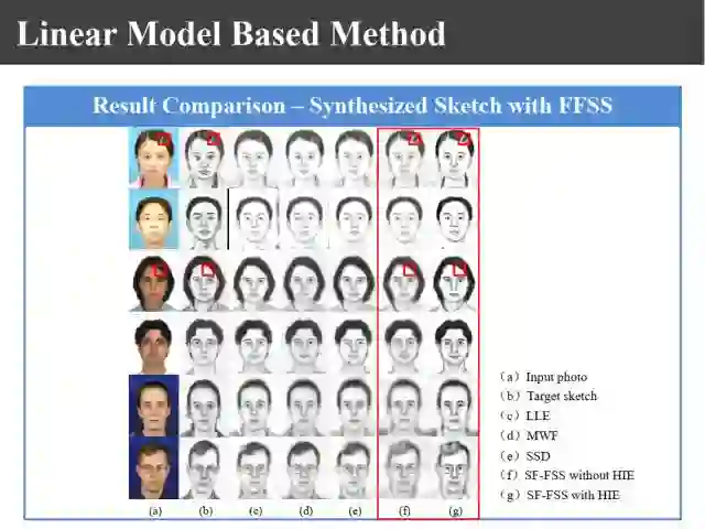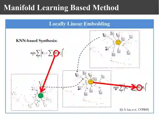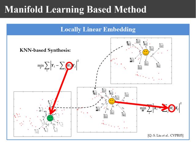 上图是刘青山教授在CVPR2005上提出的改进工作。受启发于当时如火如荼的流形学习,他认为把整幅图像进行合成的做法存在不足,他利用LLE的思想把照片分割成一个个照片块或者画像块,再对每一块进行线性组合,组合以后把对应画像利用对应的系数合成照片,这样就把整幅图像的线性转变成局部线性嵌入。