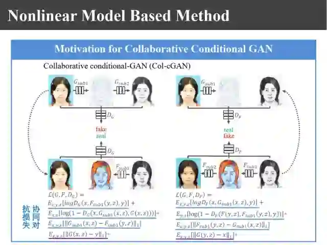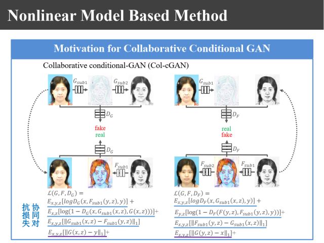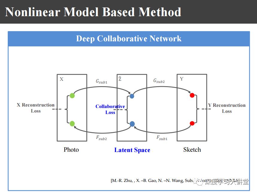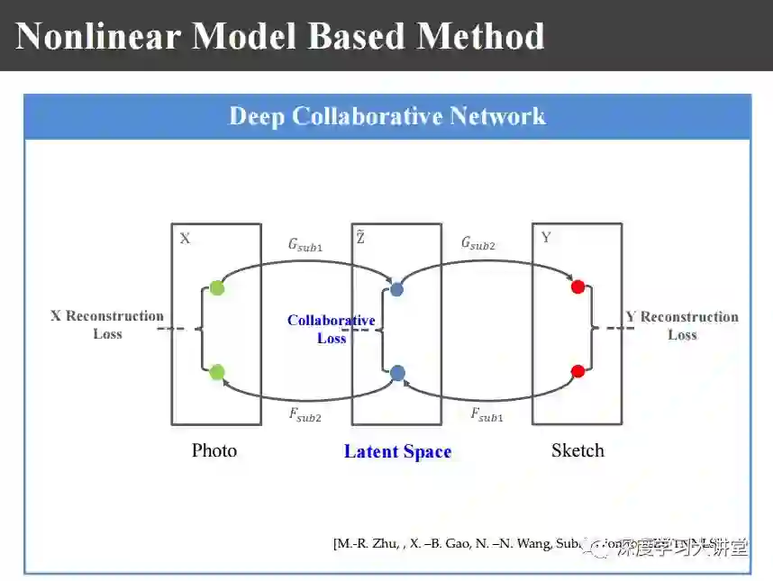 最近,大家都比较熟悉所谓的基于端对端的学习,还有上图基于conditional GAN的方法。不管是照片还是画像,把它映射到另外的异质图像域里,在这个图像域计算它的重建损失reconstruction loss。