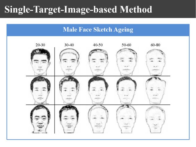 当然我们还可以合成不同年龄的人脸。如果小孩走丢的时候是7、8岁,现在已经17、18岁,我们可以根据年龄的迁移合成不同年龄段的画像。以上主要讲的是由照片生成画像,当然也可以实现由画像生成照片,因为该过程是可逆的。