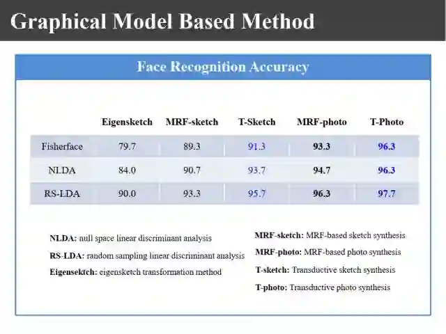 上图是不同的数据库,包括香港中文大学的CUFS和CUFSF数据库,印度的IIIT数据库,网上的数据库,照片、可见光和近红外的数据库,可见光和热红外的数据库。这里所谓的异质图像是指不同传感器得来的图像。