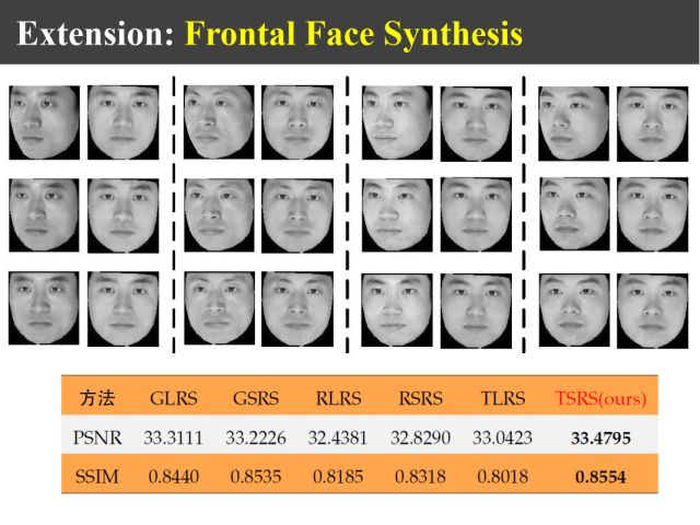 上图是我们和其他方法合成效果的对比图。对于第一行戴发卡的女孩,其他方法生成出来很难有发卡,我们的方法可以很好地把发卡合成出来。同样戴眼镜的照片也是,以前的方法本身合成不出来眼镜,因为训练样本里面没有人戴眼镜,但是通过全局学习,眼镜可能就是利用他的下巴合的轮廓成出来,这样一来可以合成训练样本中没有的细节信息。