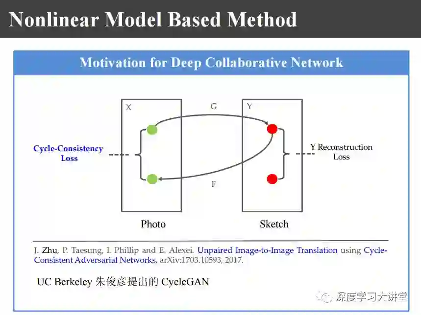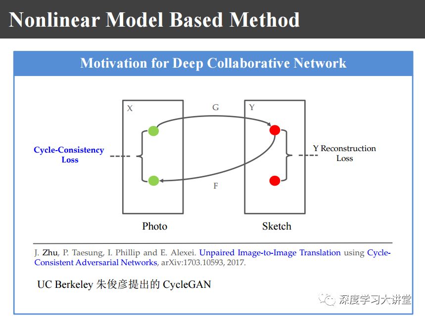 后来UC Berkeley的朱俊彦博士提出了上图的CycleGAN,对照片或者图像映射到异质图像域以后再反映射回来,在原始图像域计算Cycle-Consistency Loss。比如,在超分辨重建的时候没有高清图像,在这高分辨域没办法算Loss函数,还要再反映射回来在低分辨域计算它的Loss函数。