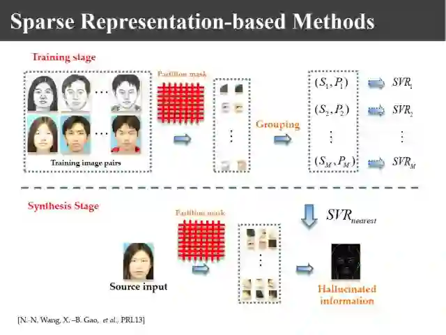 原先我们的合成是基于local mean的,这个新的学习算法实际上是一个nonlocal mean。nonlocal mean存在一个问题,如果我们要搜索一个眼睛的话,需要在整幅图上搜索它的近邻区域,这样的整幅图像搜索速度非常慢,为此我的团队提出了上图所示的基于稀疏表示的贪婪学习方法。利用训练样本我们可以构造一个字典,把每一个图像块利用字典来表示,得到基于字典的表示系数,形成一个稀疏系数矩阵,这样来一个测试图像以后,同样的也可以用字典来表示成一个系数序列。进行匹配的时候就像一个哈希搜索一样就变得非常快,这样一来就解决了快速全局搜索的问题。