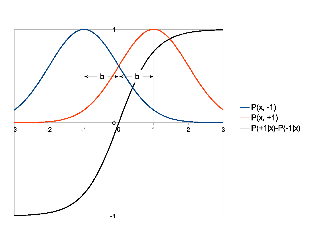 考虑一对形状相同的一维高斯函数,二者宽度 h 相等,期望值分别是-b 和+b。则条件概率的差异定义为: