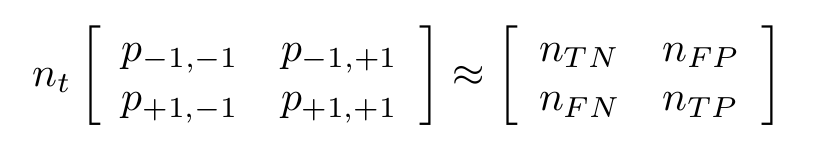 通过将测试样本按数量分割,混淆矩阵可以使用一个联合概率近似表达出来。考虑如下二元分类器: