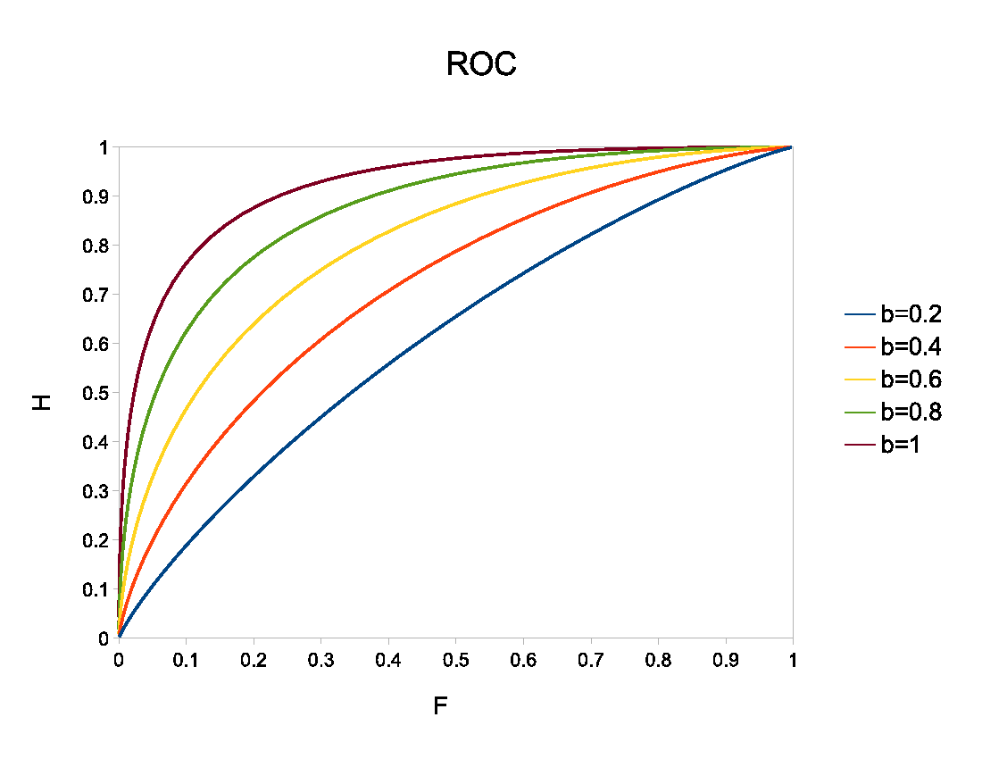 根据这五个参数,你可以写下简单二元分类器所有可能的技术得分。受试者工作特性(ROC)曲线的受试者通过在分类阈值变动的情况下绘制两个此类技术得分的对比图得出。以下是命中率: