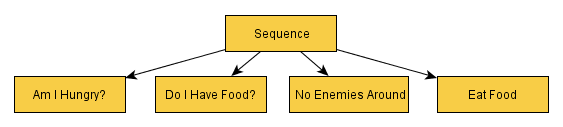 行为树的工作方式是从左到右询问问题。一个成功允许沿着树前进,而失败将会返回到序列节点。过程如下:序列→我饿了吗?(成功)→序列(运行)→我有食物吗?(成功)→序列(运行)→周围没有敌人(成功)→序列(运行)→吃东西(成功)→序列(运行)→父节点(Simpson,2014 年)。如果在任何时刻,其中一个节点返回(失败),那么整个序列都将会失败。例如,如果结果是“我有食物吗?”失败了,它就不会再检查周围是否有敌人,也不会再吃东西。相反,这个序列将会失败,而这将是该序列的结尾。