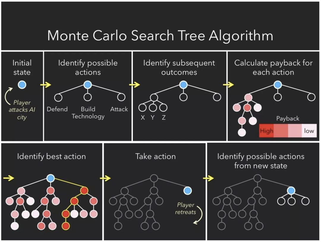 图 2 突出显示了使用蒙特卡洛树搜索的计算机在针对人工组件采取动作之前所经历的过程。它首先要查看它拥有的所有选项,在上面的示例中,这些选项要么是防御,要么是构建技术,要么是攻击。然后,它构建了一棵树,预测此后每一次潜在动作成功的可能性。上面我们可以看到成功率最高的选项是“攻击”(因为暗红色表示更高的奖励概率),因此计算机选择攻击。当玩家进行下一步动作时,计算机将重复树的构建过程。