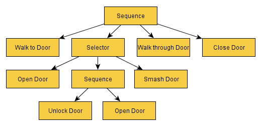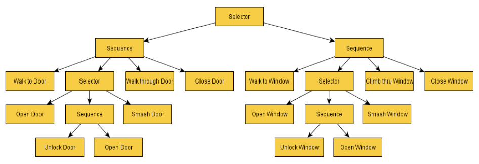 在深入了解人工智能异形的运行原理之前,重要的是首先要强调影响决策过程的结构。人工智能异形使用了一棵广泛的行为决策树,这棵树包含超过 100 个节点和 30 个选择器节点。想象一下下面的简单例子: