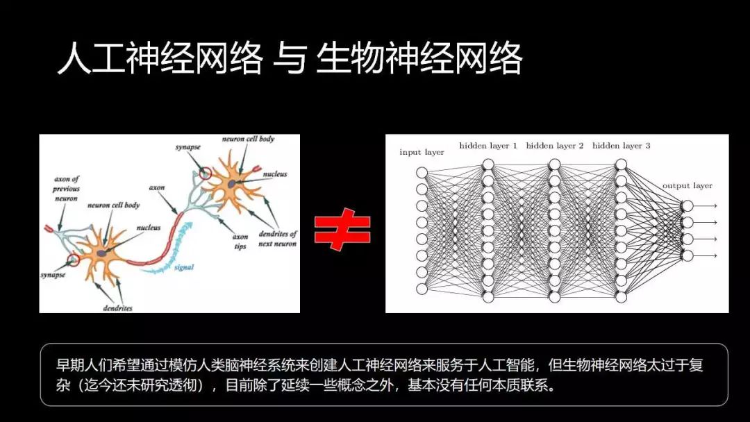 早期人们希望通过模仿人类脑神经系统来创建人工神经网络来服务于人工智能,但生物神经网络太过于复杂(迄今还未研究透彻),目前除了延续一些概念之外,基本没有任何本质联系。